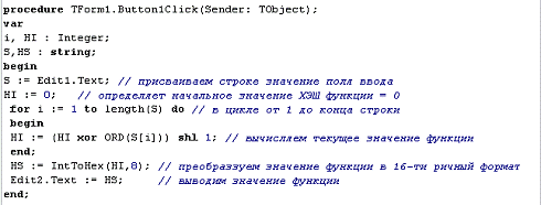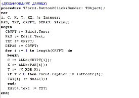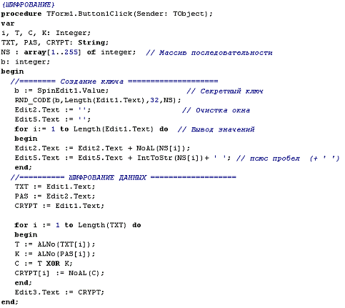 Процедура шифрования реализована в обработчике события onClick кнопки Button1.