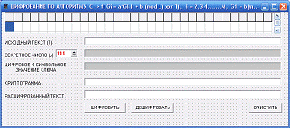 Сетку StringGrid1, предназначенную для отображения собственного алфавита, пять полей ввода Edit1 - Edit5, поле ввода секретного числа - SpinEdit1, три кнопки Button1 - Button3 и метки Label1 - label5 статически описывающие назначение полей.