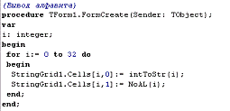 алфавита в сетку выполнила при помощи создания формы в обработчике события