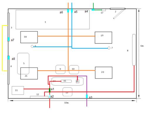 Исходя из того, что кроме телефонной линии необходимо защитить помещение по остальным каналам утечки. На схеме поводки (рис.5) в точках а3,а4,а5,а6 необходимо обеспечить защищенности речевой информации от утечки по проводам, а в точках а7,а8 обеспечить защиту от лазерных микрофонов. Поэтому оптимальным решением было бы использование шумогенератора, который сведет угрозы к минимуму.