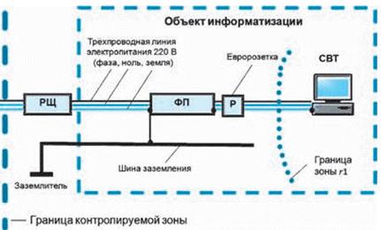 На рисунке (рис. 4) показана схема установки трехпроводного помехопадавляющего фильтра типа ФП на объекте информатизации. При этом должны быть соблюдены следующие требования и рекомендации: