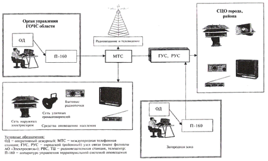 Система оповещения любого уровня РСЧС представляет собой организационно-техническое объединение оперативно-дежурных служб органов управления по делам гражданской обороны и чрезвычайным ситуациям (ГОЧС) данного уровня, специальной аппаратуры управления и средств оповещения, а также каналов (линий) связи, обеспечивающих передачу команд управления и речевой информации в чрезвычайных ситуациях.