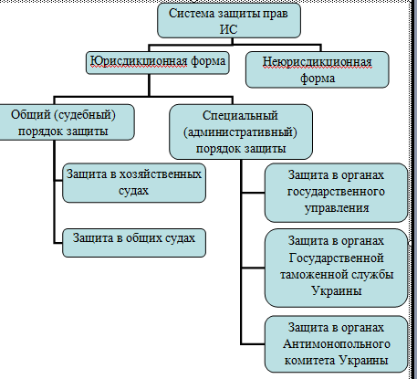 Под защитой прав интеллектуальной собственности понимается применение предусмотренных законодательством мер по признанию прав, их восстановлению, пресечению нарушений, применение к нарушителям мер ответственности, а также сам механизм практической реализации этих мер. Предметом зашиты являются субъективные права интеллектуальной собственности и охраняемые законом интересы авторов и правообладателей [7]. На сегодня система защиты прав интеллектуальной собственности представлена 2 формами (рис. 1) [9]: