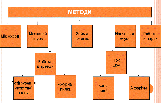 До інтерактивних методів навчання належать такі методи: мікрофон, мозковий штурм, займи позицію, навчаючи - вчуся, робота в парах, робота в трійках, ток-шоу, розігрування сюжетної задачі, ажурна пилка, коло ідей, акваріум та інші.