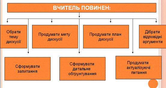 Проведення уроків із застосуванням інтерактивних технологій опрацювання дискусійних питань потребує ретельної підготовки вчителя. Передусім це стосується вибору теми дискусії, чіткого формулювання суперечливих та дискусійних питань; продумування мети дискусії; питань, які сприяють активізації діяльності учнів з вирішення завдання; детального обґрунтування висловлюваних тверджень, добору аргументів, продумування плану дискусії тощо. Вчитель певним чином керує навчальною дискусією, створює атмосферу доброзичливості, взаємної підтримки та довіри, відкритості, співтворчості, співпраці, але перш за все педагог має кваліфіковано керувати процесом пошуку істини учнями.