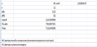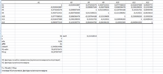 Т.к FGнабл (79) > FGкр (33), гипотеза Н0 по-прежнему отклоняется, факторы мультиколлинеарны, но т.к. Fнабл больше Fкр не более чем в 3 раза, то с такой моделью работать можно. В дальнейшем в анализе будут участвовать только данные факторы, которые не влияют на мультиколлинеарность.