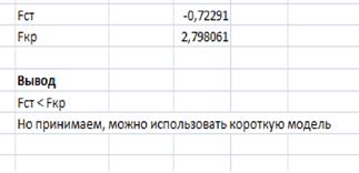 Для того, чтобы выбрать наилучшую модель мы должны сравнить значения коэффициента детерминации R2 и выбрать наибольшее. R2 длинной равен 0,800, а R2 короткой 0,791. Несмотря на то, что первое больше, показатели не сильно различаются, поэтому переходим к выполнению другого способа сравнения - тест по критерию Фишера.