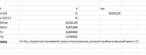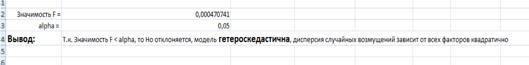 Т.к значимость F< alpha, то H0 отклоняется, модель гетероскедастична, дисперсия случайных