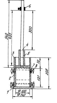 1000 см3, диаметром 100 мм и высотой 127 мм; верхнего стакана (насадки) 3; стойки с уплотнителем 4 (вес стойки с уплотнителем 1,4 кг); груза 5 весом 2,5 кг; ограничительного кольца 6 с винтом и зажимного кольца 7 с зажимными винтами 8.