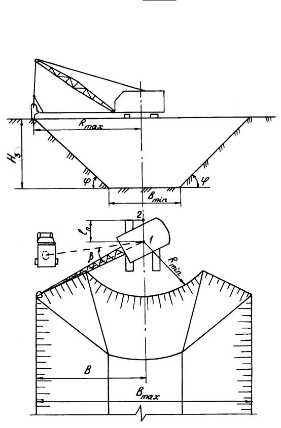 Размеры забоя для драглайна зависят от тех же параметров, что и для экскаватора прямая лопата (п. 2.1.2). Для того чтобы построить шаблон экскаваторной проходки с торцовым забоем, необходимо определить значения Bmax и Bmin, то есть соответственно ширину забоя по верху и по дну проходки (см. рис. 2.5). Как следует из приведенной схемы забоя, величина Bmax = 2B, где B – расстояние от оси стоянки экскаватора до верхней бровки бокового откоса. Это расстояние определяется по формуле: