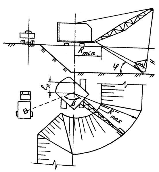 здесь Rmin – минимальный радиус копания на уровне стоянки экскаватора; его значение определяется условиями устойчивости экскаватора.