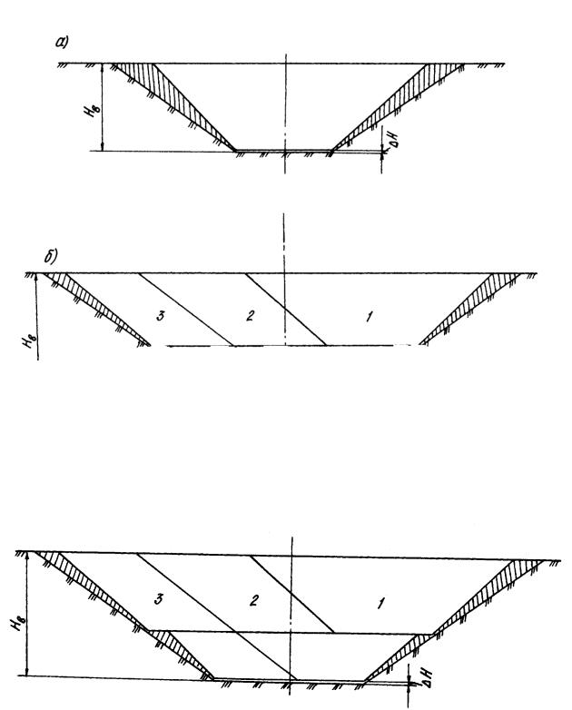 Благодаря тому, что драглайны обладают значительно большим, чем экскаваторы прямая лопата, радиусом копания, разгрузки и высотой разгрузки, во многих случаях в процессе проектирования выявляется возможность разработки выемки до проектной отметки одной единственной торцовой проходкой (рис. 2.7,а) либо несколькими последующими торцовыми проходками (рис. 2.7,б). При этом последующие торцовые проходки отличаются от первой тем, что один из их боковых откосов образуется предыдущей проходкой.