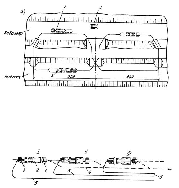 III – то же, со скреперов № 3; 1 – тягач скрепера; 2 – ковш скрепера; 3 – трактор-толкач;