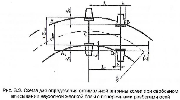 За расчётную схему определения оптимальной ширины колеи принимают схему свободного вписывания, при которой железнодорожный экипаж своим наружным колесом передней оси жёсткой базы прижимается к наружному рельсу кривой, а задняя ось жёсткой базы занимает радиальное положение. При этом центр вращения экипажа находится на пересечении радиуса с продольной геометрической осью экипажа.
