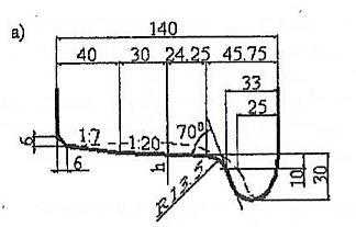 Колёсная пара состоит из стальной оси, на которую наглухо насажены колёса с бандажами, имеющими для предотвращения схода с рельсов направляющие гребни. Сечение стандартного бандажа локомотивной колёсной пары показано на рис.2. Внешняя поверхность имеет специальный профиль, состоящий из гребня, основной поверхности с каноничностью 1:20 и боковой поверхности с коничностью 1:7, а также торцевой фаски под углом 45°.
