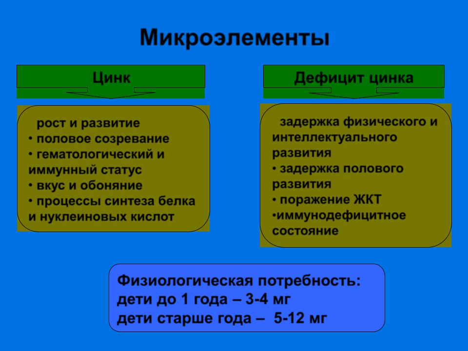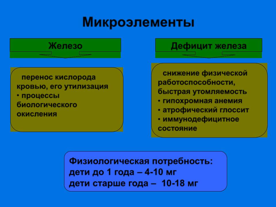 Физиологическая потребность: дети до 1 года – 4-10 мг дети старше года – 10-18 мг