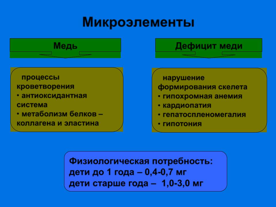 Физиологическая потребность: дети до 1 года – 0,4-0,7 мг дети старше года – 1,0-3,0 мг