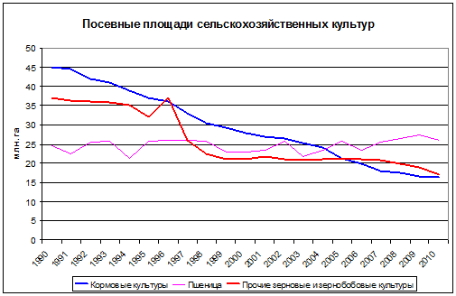 В основном снижение происходило за счет сокращения площадей под кормовые культуры, которые уменьшились с 44,6 млн. га в 1990 году до 18 млн. га в 2010 году (т.е почти на 60%). При этом размер площадей, отведенных под пшеницу колебался в пределах 22 - 29 млн. га. Сокращение посевных площадей кормовых и других зерновых культур наряду с рядом прочих факторов отрицательно сказалось на развитии отечественного животноводства.