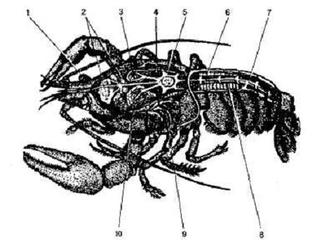 Строение речного рака: 1 - глаз; 2 - желудок; 3