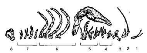 ходильные ноги; 7-брюшные конечности; 8-хвостовой плавник.