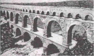 Уже тогда, используя труд многочисленных рабов, сооружались водопроводы (акведуки), канализация (клоаки) и в их числе знаменитая «клоака максима», бани (термы). В последующем акведуки размешались на высоких столбах - аркадах, достигающих подчас более 50 м; к концу Римской империи только в одной столице их было более 70; Рим, как никакой яругой город, не только в древности, но и в последующем обильно снабжался водой 900 л в день на человека; три из акведуков, доставляющие чистую воду из предгорий в окрестностях Рима, действуют до сих пор (рис. 8). Термы, особенно к концу периода республики и в период империи, представляли собой целые архитектурные комплексы из мрамора, богато меблированные, украшенные произведениями искусств; в них не только мылись горячей и холодной водой, но и питались, проводили встречи, дискуссии, спортивные состязания, в некоторых из них были даже библиотеки. Словом, они были своего рода клубами. В термах производили и лечение средствами, как бы мы сказали, физиотерапии: ванны. души, массаж, физические упражнения и пр. По остаткам наиболее известной термы - Караколлы - можно судить о грандиозности этих сооружений. Работа и исправность водопроводов. Канализации, терм, а также рынков, стадионов, дорог, храмов и других общественных учреждений и сооружений строго регламентировались законом и контролировались властями, выделяющими особых чиновников - эдилов. Санитарное законодательство входило в так называемые «Законы двенадцати таблиц» (451-450 гг. до н.э.), которые включали также и другие юридические предписания, касающиеся, например, наказаний за членовредительство, нанесение травм (так. за перелом руки свободному человеку полагался штраф в 300 ассов - денежных единиц. а рабу - 150 ассов).