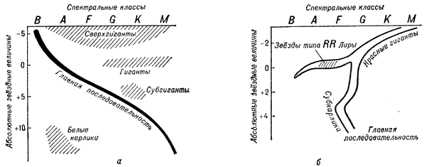 Рис. 3. Диаграмма Герцшпрунга - Ресселла (по данным наблюдений): а) для звезд плоской подсистемы Галактики; 6) для звёзд шаровых скоплений, типичных представителей звёзд сферической подсистемы.