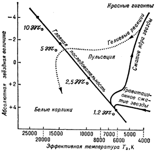 Радиусы большинства З. находят косвенным путём по светимости и эффективной темп-ре, к-рая однозначно связана со спектр, классом или показателем цвета. Массы известны только для Солнца и ряда двойных З. Поэтому удобно исключить массу из двух рассмотренных соотношений и перейти от радиуса к непосредственно наблюдаемым величинам: эффективной темп-ре или показателю цвета. Так получаются важнейшие зависимости: цвет - светимость, если за независимую переменную берётся показатель цвета, и диаграмма Герцшпрунга - Ресселла (д.Г. - Р.), если пользуются эффективной темп-рой Тэ. Обычно Тэзаменяют спектр, классом З., т. к. каждому классу отвечает определённая Тэ, а светимость - абс. звёздной величиной, к-рая пропорциональна логарифму светимости. Построенную таким образом д. Г. - Р. (рис. 3, а) применяют для сравнения выводов теории эволюции З. с наблюдаемыми фактами.
