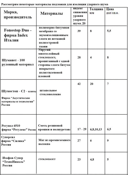 В качестве примера можно привести Foamboard-5000 от "ФАСАД СТРОЙ" (Россия), в листах толщиной 2, 3 ,5 см. Индекс снижения приведенного уровня ударного шума - 25 Дб. Цена (2 см) -1,1 дол/м2.